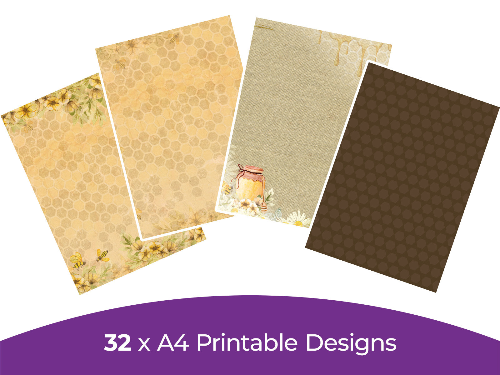 The Bee-Youtiful Digital Paper Pad includes 32 bee-themed designs set against a range of warm summery colours like golden yellows and floral greens. These designs include bees buzzing all over, jars of honey, and sunflowers, perfect for handmade seasonal greeting cards, scrapbook pages, and more.
