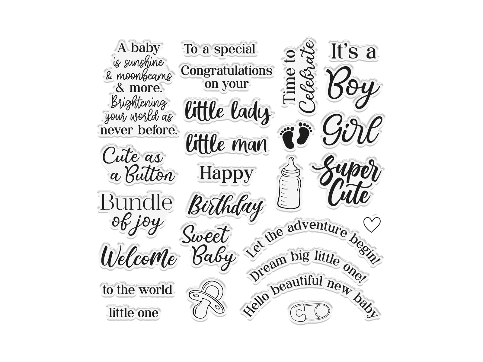 - Includes 26 acrylic stamps with baby-themed sentiments.