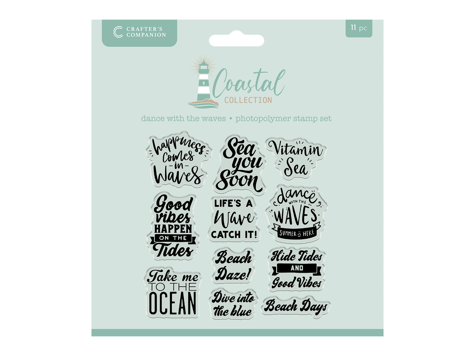 Let a wave of positivity wash over your crafts and projects with the Dance with the Waves Photopolymer Stamp Set from the Crafter’s Companion Coastal Collection. This set of 10* stamps feature encouraging and positive sea-themed sentiments, perfect for your handmade greeting cards, scrapbook pages, and more.