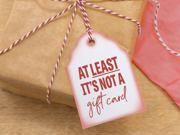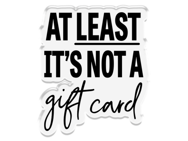 The 'Not A Gift Card' stamp reads 'At Least It's Not A Gift Card' in a large bold font with the words 'Gift Card' in a smaller, handwritten italic font below the main message. This stamp will definitely grab anyone's attention and will add the perfect humorous message onto your gift tags.